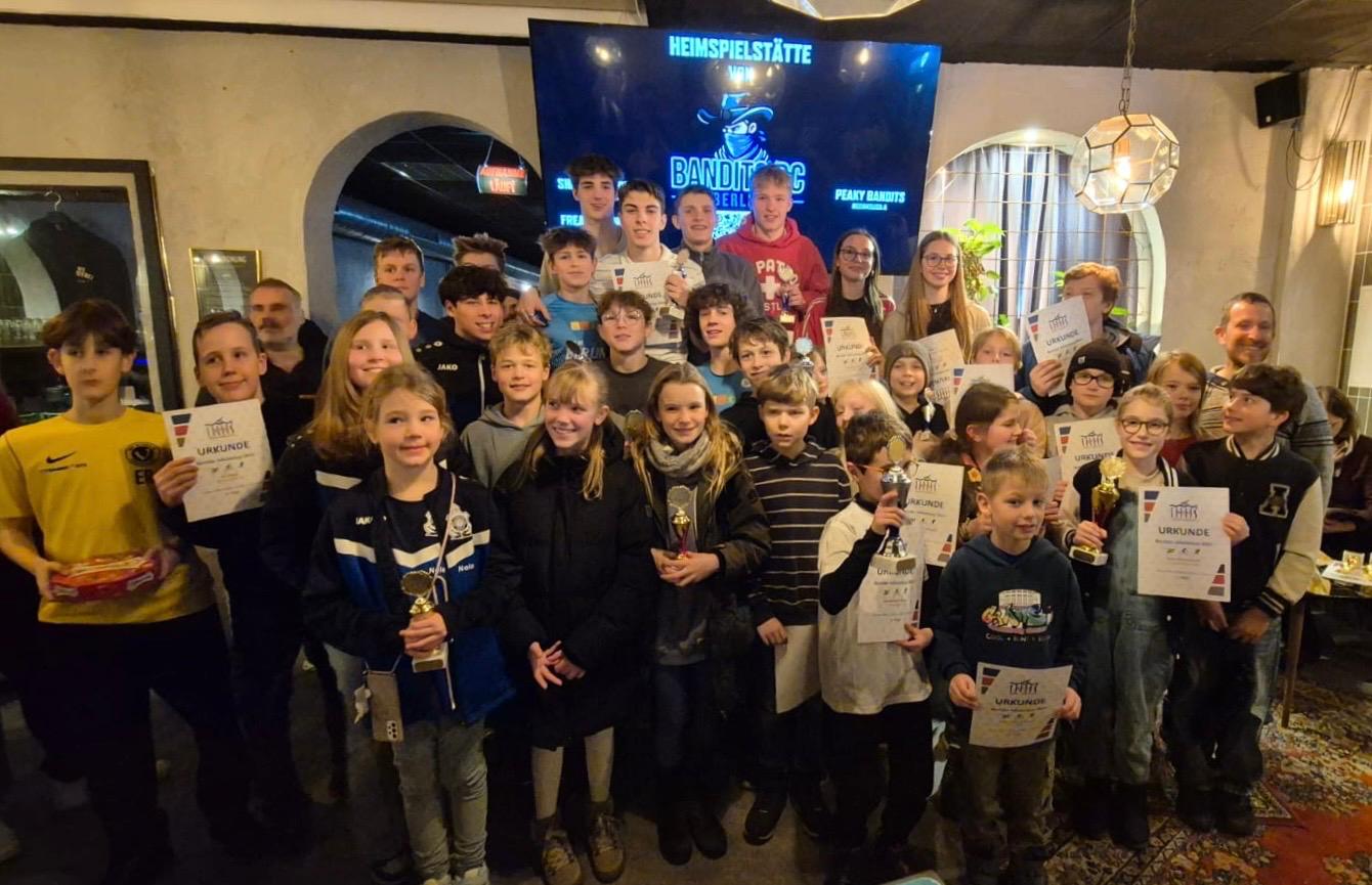 [12.01.2026] Letzten Samstag fand in der Darterei die Ehrung für den BTU-Schülercup 2025 statt. Insgesamt kamen 40 Jugendliche nach Berlin Weißensee, um im 1-gegen-1-Modus die Besten zu ermitteln. Anschließend überreichte BTU-Jugendwart Claudio Cuccoli allen Teilnehmenden, die es in die Wertung des Schülercups geschafft hatten, eine Urkunde. Dazu gab es Pokale für die jeweils drei Bestplatzierten der einzelnen Altersklassen.